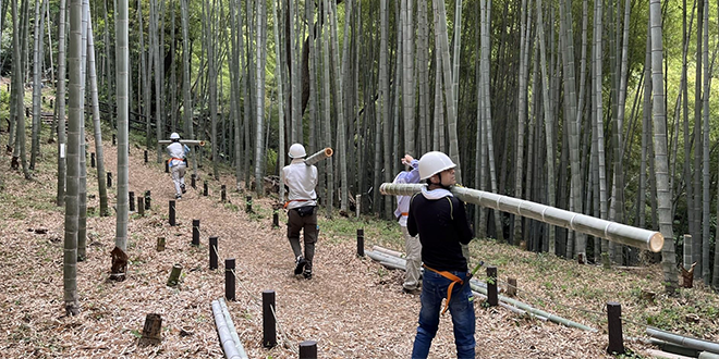 Kioxia Group’s research and technology development base, Yokohama Technology Campus, participates in the Sakae Green Supporter program in Sakae Ward, Yokohama City, Kanagawa Prefecture. In 2024, a total of 20 employees contributed to the sustainability of local greenery and water resources through activities such as bamboo forest thinning and rice planting.